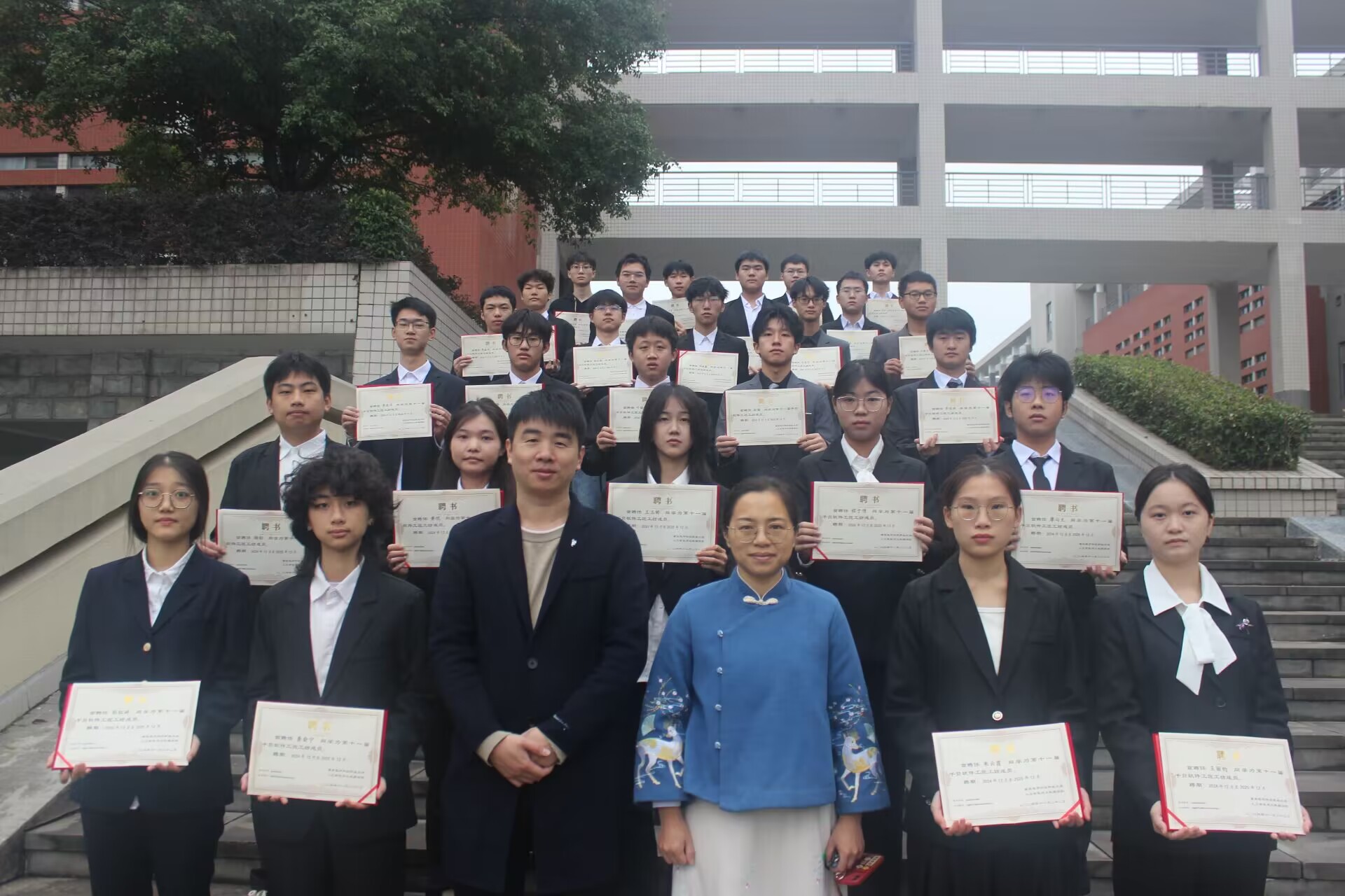 2024年11月24日9:30,在南区阶梯处由朱堂勋老师,任丹丹老师给十一届千贝软件工匠工坊成员颁发了聘书,并合照。