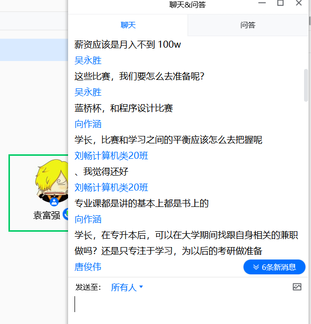 此次会议为线上线下结合以主题讲解、对话分享、全体互动讨论形式进行。会上符川学长与袁富强学长分享了自己的学习经验与职场应变技巧并推荐了学习平台,对同学们的积极提问也进行了仔细的解答。在这次会议上学长们慷慨分享让同学们收益匪浅,不仅学到如何规划好学习计划平衡好比赛与学业的时间冲突,还了解到当下前后端行业行情和未来发展热门的技术与语言。