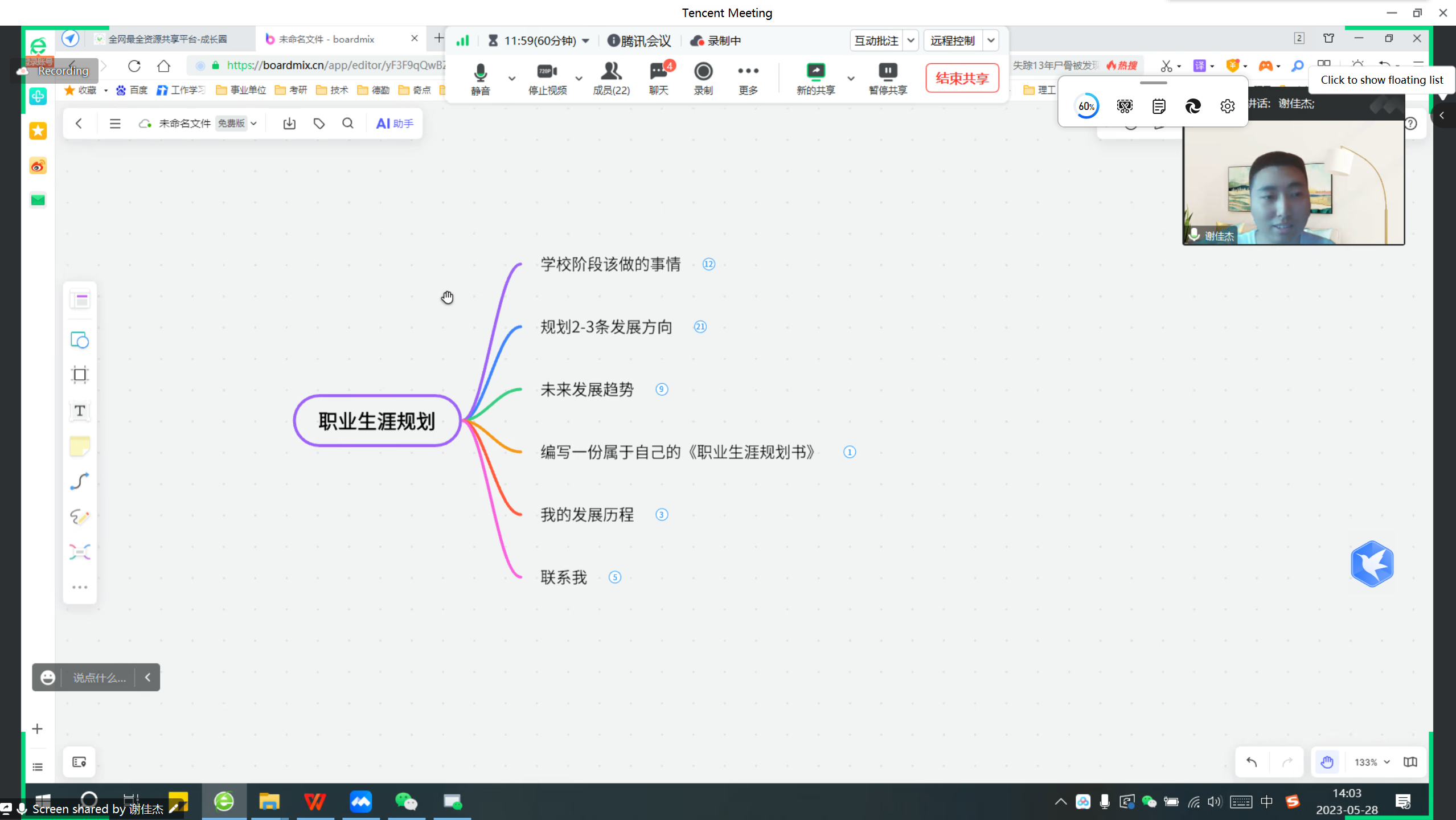 为了帮助同学们更好地了解当前职场需求,提升大家的综合素质和竞争力,千贝大讲堂于 2023年5月28日下午在腾讯会议(会议号:957-932-081)上进行了一场职业规划技能讲座。本次讲座特邀千贝工匠工坊第三届学长谢佳杰为千贝工匠工坊第九届成员和千贝社团的同学们进行了详细解读,主题为“掌握核心竞争力以应对当前社会需求的职业规划”。